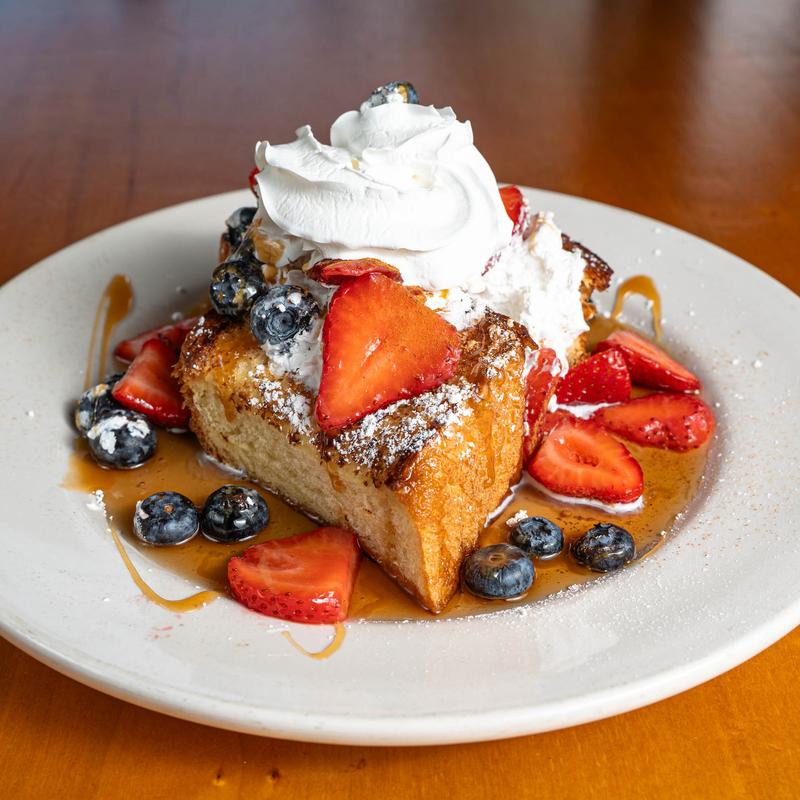 Short Stack $8.75 | Big Stack $14.50 • Thick challah french toast topped with fresh strawberries, blueberries and whipped cream.