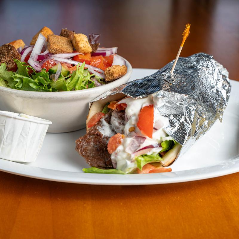 Choice of lamb or chicken with lettuce, tomato &red onions, topped with tzatziki sauce & wrapped in pita bread.