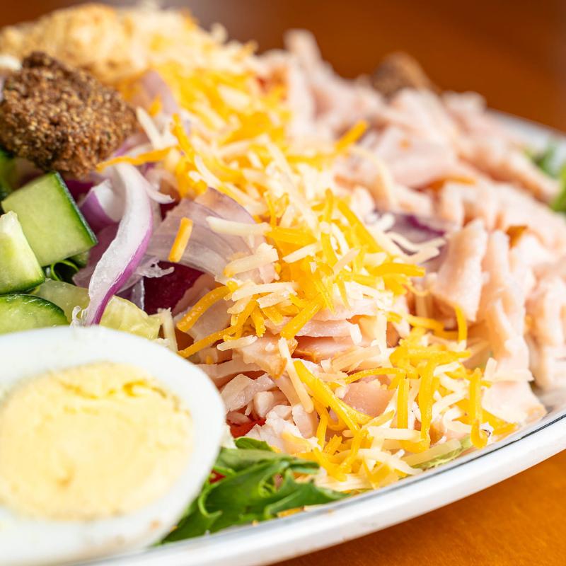 Chopped greens, turkey, ham, hard boiled egg. tomatoes, cucumbers, red onions, cheddar cheese & croutons.