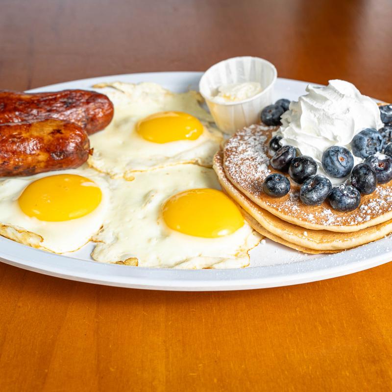 Three farm fresh eggs served any style, pancakes or French toast, bacon or sausage and a biscuit.