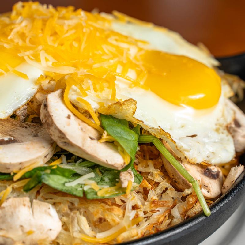 Spinach, mushrooms and cheddar jack cheese. Topped with two eggs any style.