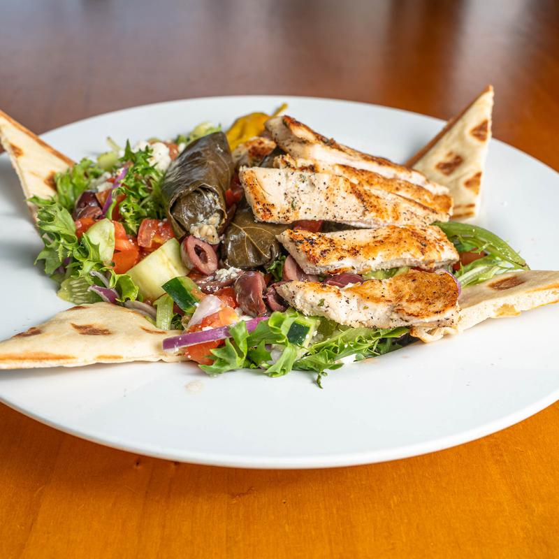 Chopped greens, feta cheese, kalamata olives, red onions, tomatoes, cucumbers, pepperoncini & stuffed grape leaves with Greek dressing, served with toasted pita bread.