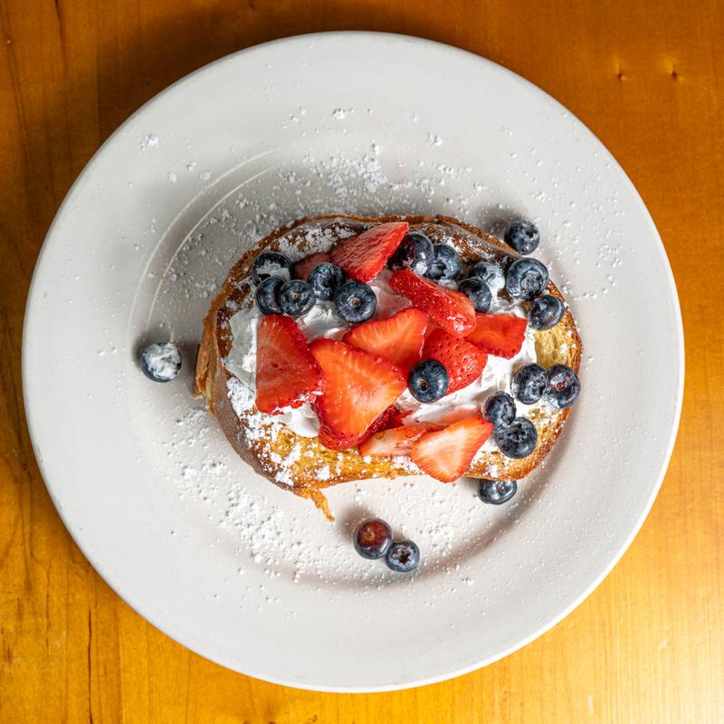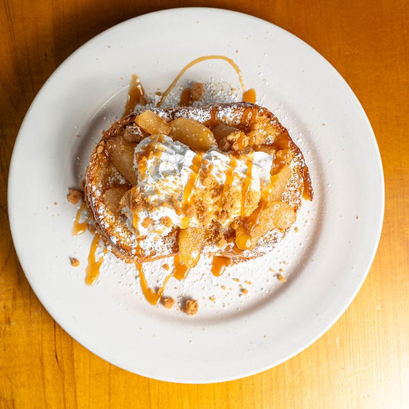 Short Stack $5.95 | Big Stack $11.95 • Made with homemade challah bread, topped with powdered sugar.